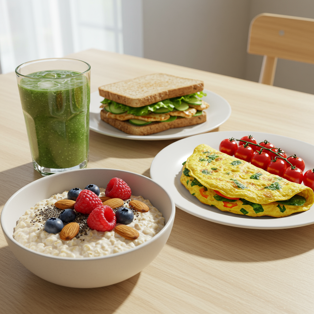 - 채소 스무디: 시금치, 케일 등 녹색 채소에 베리류, 견과류, 단백질 파우더를 넣어 갈아 마시면 간편하면서도 영양가 높은 아침 식사가 됩니다.